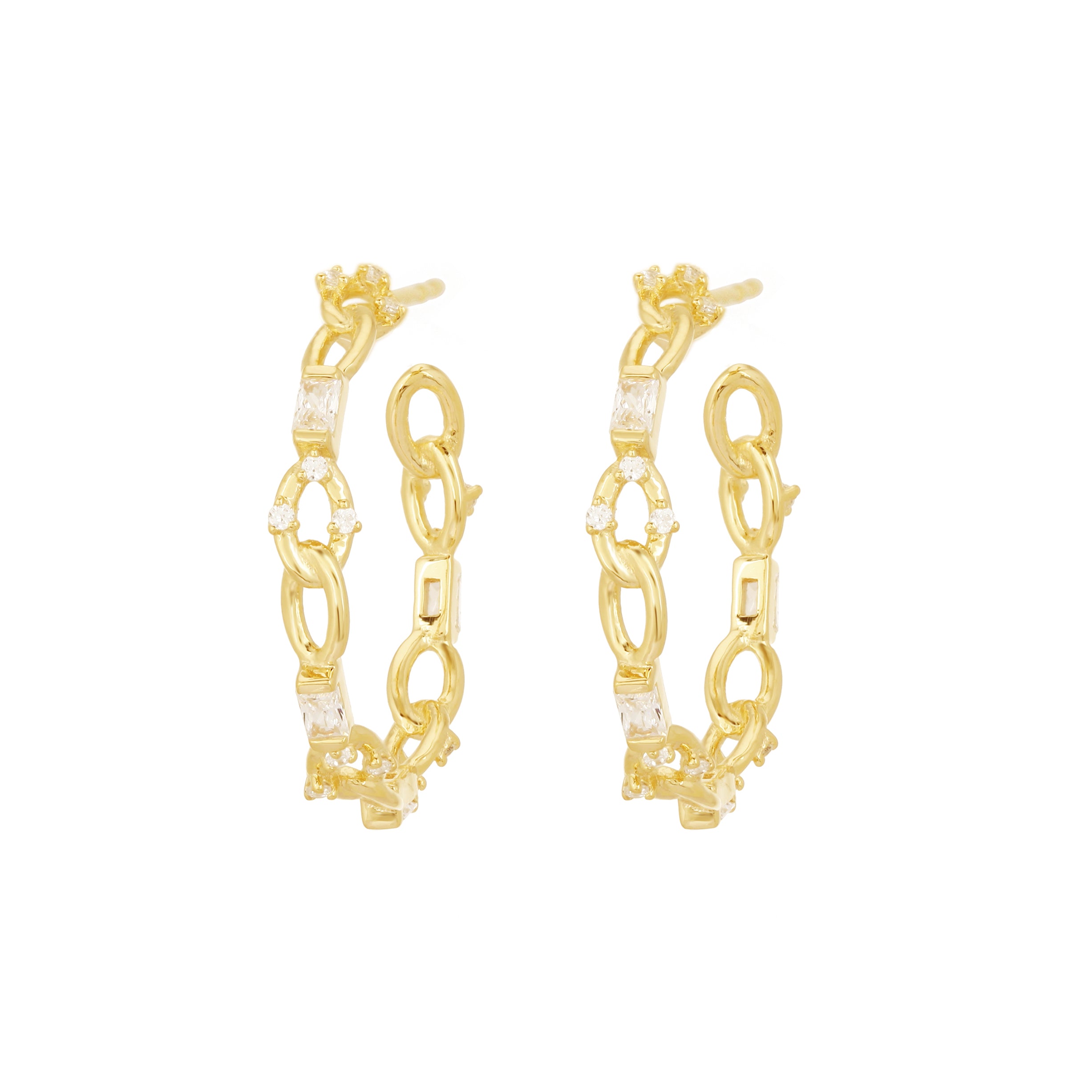 Baguette Chain Hoops, Gold with White Stones