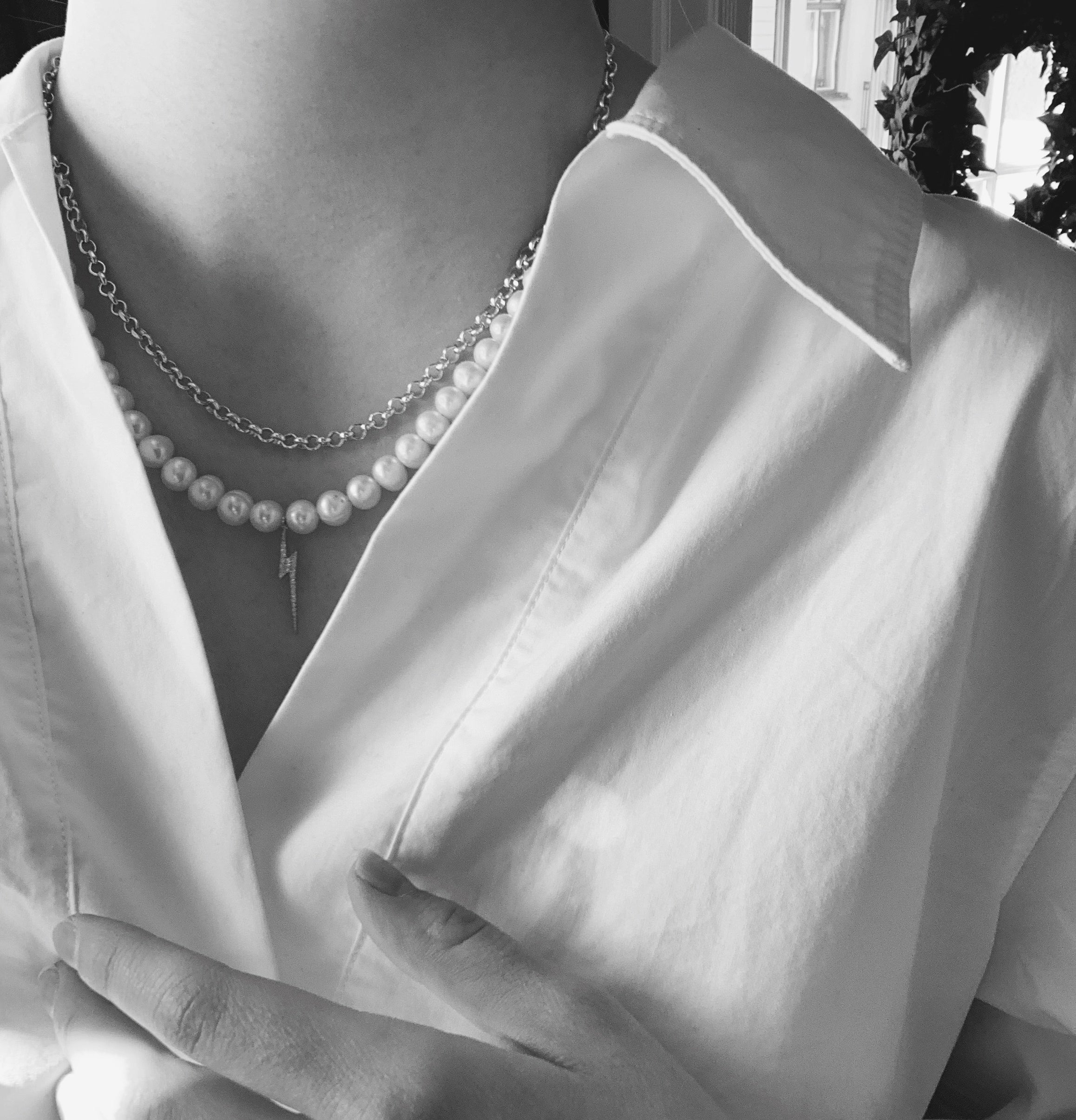 Pearls. Bolt. Halsbandet är både elegant och slitstarkt. Det är det perfekta smycket för att ge en unik och trendig touch till både vardagliga och speciella outfits. Bär det för att känna dig både glamorös och kraftfull, oavsett tillfälle. Tillverkat för hand i vårt showroom i Stockholm.