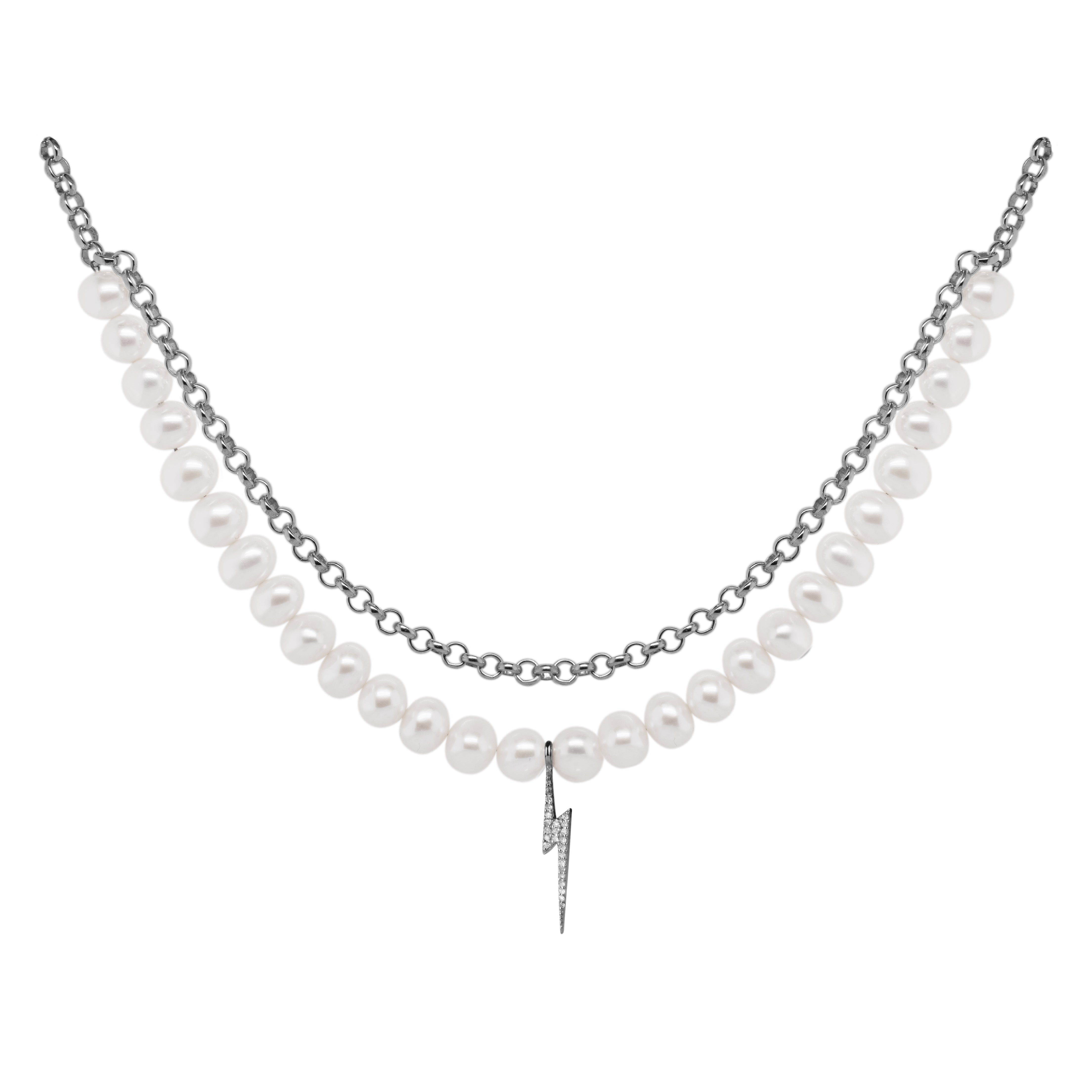 Pearls. Bolt. Necklace är en unik blandning av klassisk elegans och modern touch. Detta halsband kombinerar tidlösa pärlor med en slående blixtberlock för att skapa ett smycke som verkligen gör ett uttalande. De glänsande pärlorna ger en sofistikerad och tidlös känsla, medan blixtberlocken ger en fräsch och vågad twist. Den dynamiska kontrasten mellan de mjuka pärlorna och den djärva blixten skapar en balanserad look som fångar ögat och uttrycker både stil och individualitet.