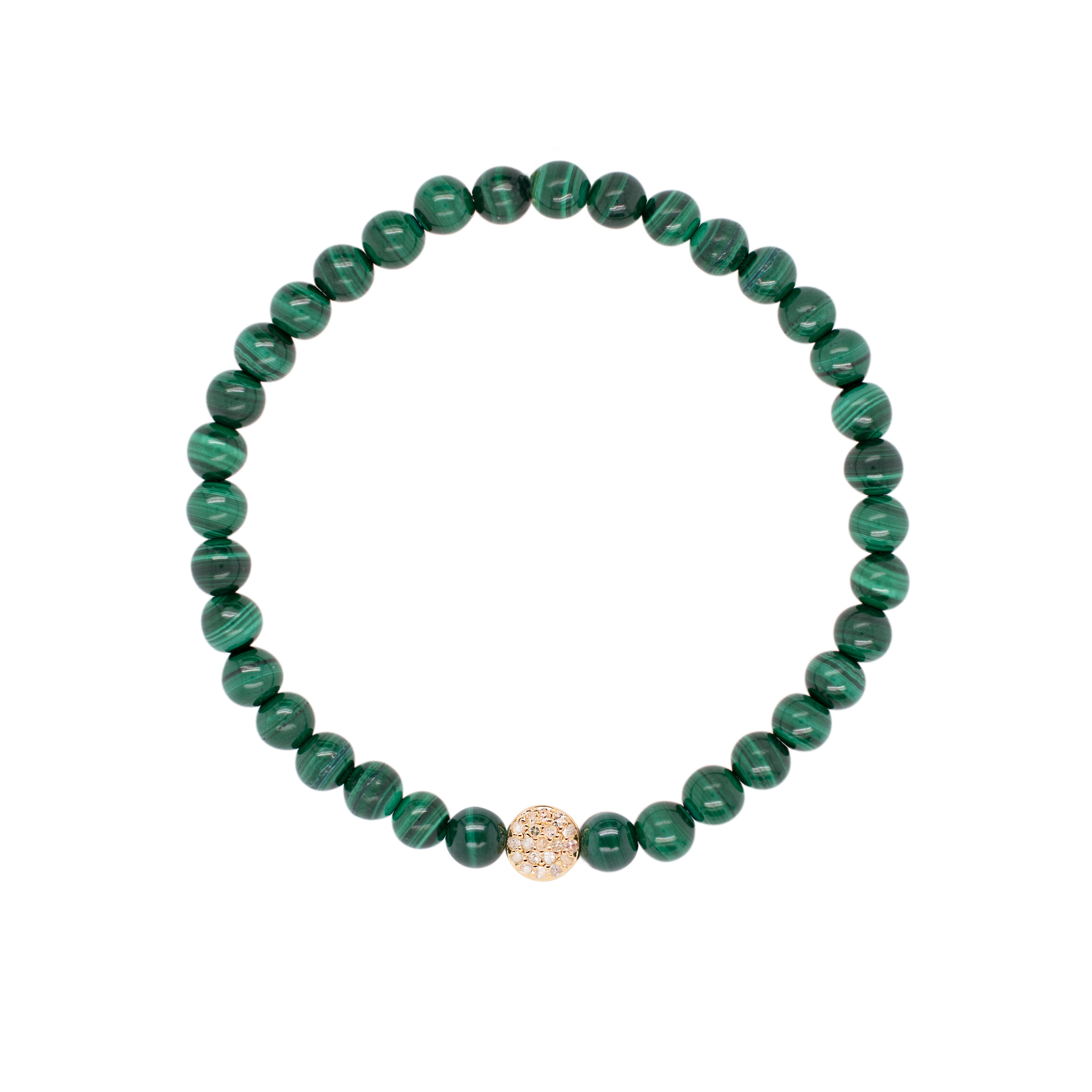När mörker möter ljus. Detta armband balanserar den djupa gröna tonen i malakiten med det subtila skimret från ljusbruna diamanter i en disk. Detta armband är ett fint tillskott till dina andra smycken. Varje garderob behöver några armband, och vi anser att detta är det perfekta. Tillverkat för hand i vårt showroom i Stockholm.