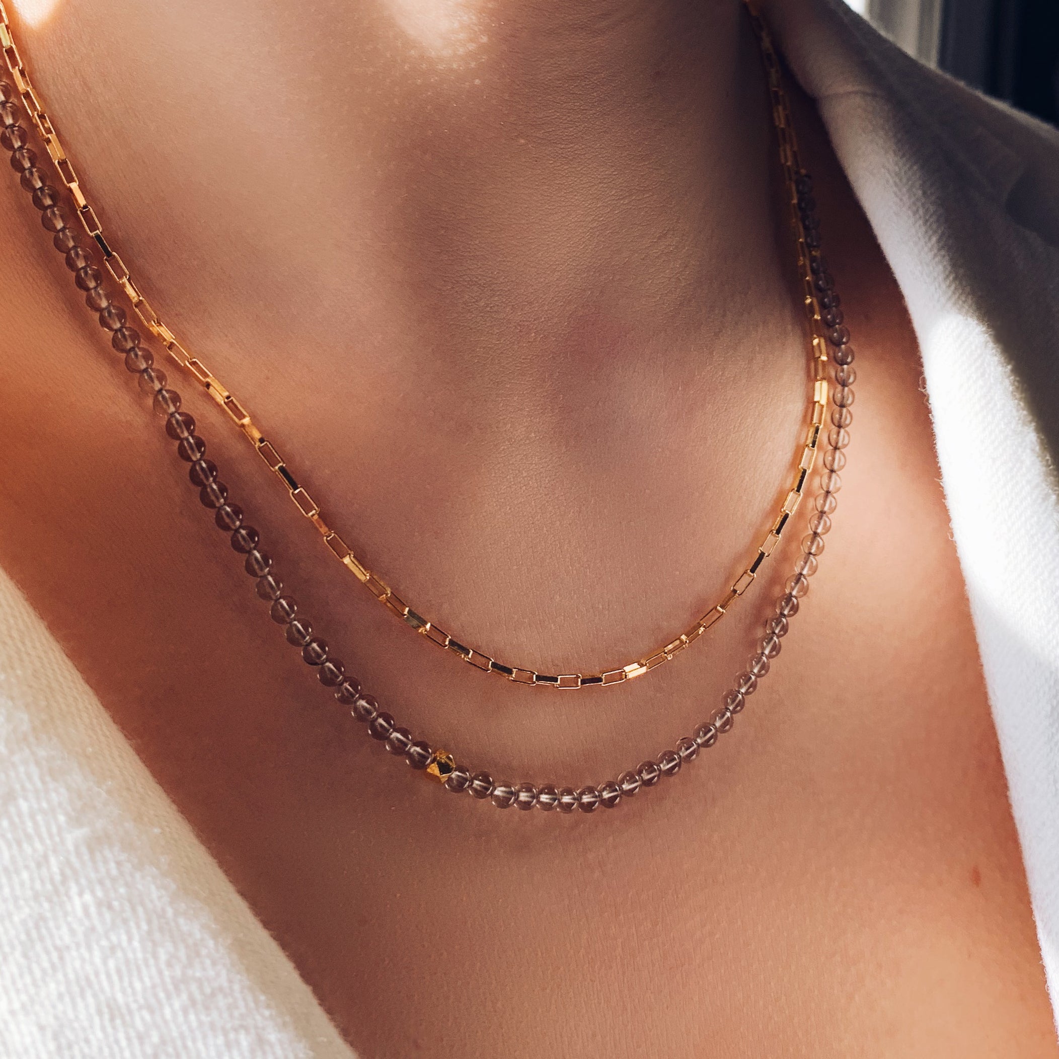 ”Att hålla rökkvarts är som att hålla fast rök i händerna.” Det är lockande och lite mystiskt. Smoky Quartz Multi Necklace är det perfekta multihalsbandet. Bär det som det är, virat runt halsen för en lager-på-lager-look, eller så kan du koppla ihop två delar av kedjan runt halsen och skapa en lager-på-lager-look med ett halsband. Endast fantasin sätter gränserna.
